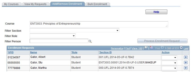 Staff members who are not defined by myUFL role UF_HR_Faculty may request the role UF_SA_CANVAS_TEACHER_CRSE_MGMT via your Department Security Administrator. If you do not know who your Department Security Administrator is, please contact the UF Computing Help Desk by phone at 352-392-4357. Please note that you MUST be enrolled as a Teacher in the e-Learning in Canvas course in order to make changes to the participants and/or sections using this tool.